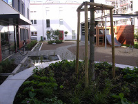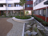 | Gestaltungskonzept: Der Wohnhof gliedert sich in Gemeinschaftsflächen und Privatgartenbereiche. Die gemeinschaftlich